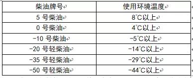 為了使發(fā)動機擁有更高的可靠性和更好的經(jīng)濟型,柴油應(yīng)選用符合19147-2018國六標(biāo)準(zhǔn)的正規(guī)柴油,并隨著地區(qū)環(huán)境氣溫的不同而選用不同牌號的清潔柴油。根據(jù)使用環(huán)境氣溫,按下表選用不同牌號的清潔柴油: