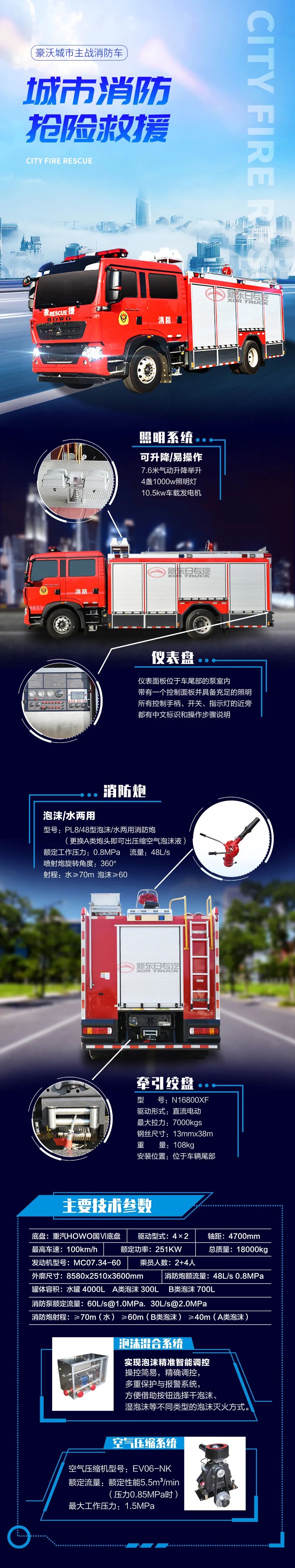 豪沃單橋城市主戰(zhàn)消防車采用中國(guó)重汽集團(tuán)濟(jì)南卡車股份有限公司生產(chǎn)的ZZ5207TXFV471GF5型二類汽車底盤, 該車原裝雙排駕駛室,可載含駕駛員在內(nèi)的乘員6人,駕乘舒適輕便。該車采用DC-CAFS60/45M型集成壓縮空氣泡沫滅火系統(tǒng),該壓縮空氣泡沫系統(tǒng)操控簡(jiǎn)易,泡沫生成實(shí)現(xiàn)即時(shí)全自動(dòng)微機(jī)精確調(diào)控,并設(shè)多重保護(hù)與報(bào)警系統(tǒng),消防作戰(zhàn)員可依據(jù)復(fù)雜的火場(chǎng)情況,方便地借助按鈕選擇干泡沫、濕泡沫等不同類型的泡沫滅火方式。該套系統(tǒng)不僅裝有A類泡沫原液,還裝有B類泡沫原液,可高效率地?fù)錅绾涂刂艫、B類物質(zhì)火災(zāi),并具備良好的環(huán)保性能。另外該車配置有牽引電動(dòng)絞盤,7.6米氣動(dòng)升降舉升4*1000w照明燈和10.5kw車載發(fā)電機(jī),使得該車還可獨(dú)立開展偵查、破拆、救生、照明、防護(hù)等綜合搶險(xiǎn)救援功能。